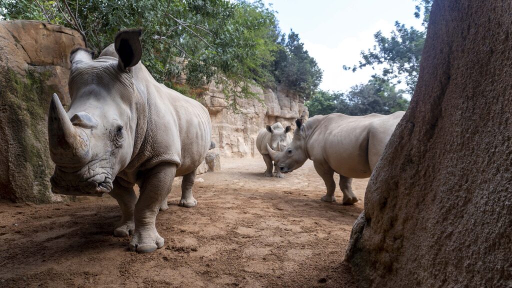 La caza furtiva para amputar su preciado cuerno y abastecer el tráfico ilegal es la principal causa del estado actual, a lo que hay que añadir la sequía y los cambios en las complicadas políticas locales. Frente a ello están siendo de gran eficacia drásticas operaciones como la extirpación preventiva del cuerno y la utilización de la última tecnología en seguimiento y localización individualizada. La difusión y la presión social para forzar políticas de protección y persecución del crimen organizado son fundamentales. BIOPARC es, en este sentido, una plataforma de concienciación y movilización de la población promoviendo el conocimiento de estas especies, así como de la protección de la biodiversidad. Igualmente importante es la participación de BIOPARC Valencia en el Programa Europeo de Conservación (EEP) del rinoceronte blanco sureño(Ceratotherium simum simum), albergando un grupo compuesto por el macho Martin y las hembras Ami, Nombula y Kwanza, esta última en avanzado estado de gestación. Un formidable recinto multiespecie que recrea la sabana permite contemplarlos conviviendo con la cebra de Hartmann (Equus zebra hartmannae) y peculiares aves como el marabú (Leptoptilos crumeniferus), el pelícano (Pelecanus onocrotalus) y el ibis sagrado (Threskiornis aethiopicus). Asimismo, cabe recordar que los rinocerontes son auténticos guardianes de la naturaleza, al dispersar semillas con sus excrementos y enriquecer el suelo con nutrientes. Gracias a ellos, muchas otras especies de animales y plantas encuentran alimento y hábitat, lo que los convierte en una pieza clave para la salud de los ecosistemas.