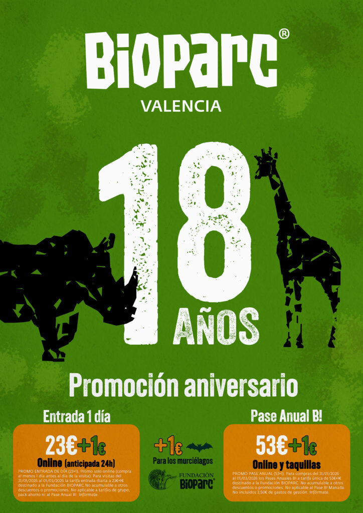 El compromiso con la sociedad y el futuro de nuestro planeta forma parte de las acciones de BIOPARC y, especialmente, de las celebraciones. En esta ocasión, para abarcar todavía más días, la promoción del aniversario comienza este fin de semana (sábado 31 de enero) y se alargará hasta el domingo 1 de marzo. Bajo el propósito de presentar opciones para “todos los gustos”, la promoción es doble y así es posible elegir entre la entrada de un día por 23€+1€ (compra solo on line y, al menos, el día anterior a la visita) o el pase B! de un año por solo 53€+1€ (en este caso, disponible tanto en la web como en la taquilla del parque). Esta promoción “con causa” está vinculada a la preservación de la especie más valenciana, el murciélago y cada +1€ de las entradas y pases B! se destinarán a través de la Fundación BIOPARC a la recuperación de las distintas especies de murciélagos de la Comunitat Valenciana, que se encuentran en riesgo de desaparecer y es necesario actuar para que dispongan de ambientes seguros y vuelvan a habitar nuestras tierras. Si durante estos 18 años descubrir BIOPARC ha sido una experiencia única para millones de personas, este 2026 comienza de forma extraordinaria, con verdaderos hitos en la conservación de la biodiversidad como son el nacimiento del primer rinoceronte, que ya se encuentra a la vista del público, y que se añade a las crías de chimpancé o de elefante. Cabe insistir en que estas nuevas “vidas” representan la esperanza para estas especies en grave riesgo de extinción y que se producen gracias a la exitosa participación de BIOPARC en los programas internacionales que luchan por conseguir poblaciones “de reserva” con criterios científicos y bajo atención humana que garanticen su supervivencia. Todo el equipo de BIOPARC está orgulloso de este trabajo que aporta el máximo bienestar a los animales y que ofrece una vivencia sensacional a las personas, con multitud de actividades, y compartiendo el amor y respeto por esta maravillosa naturaleza que tenemos la responsabilidad de cuidar y mantener.