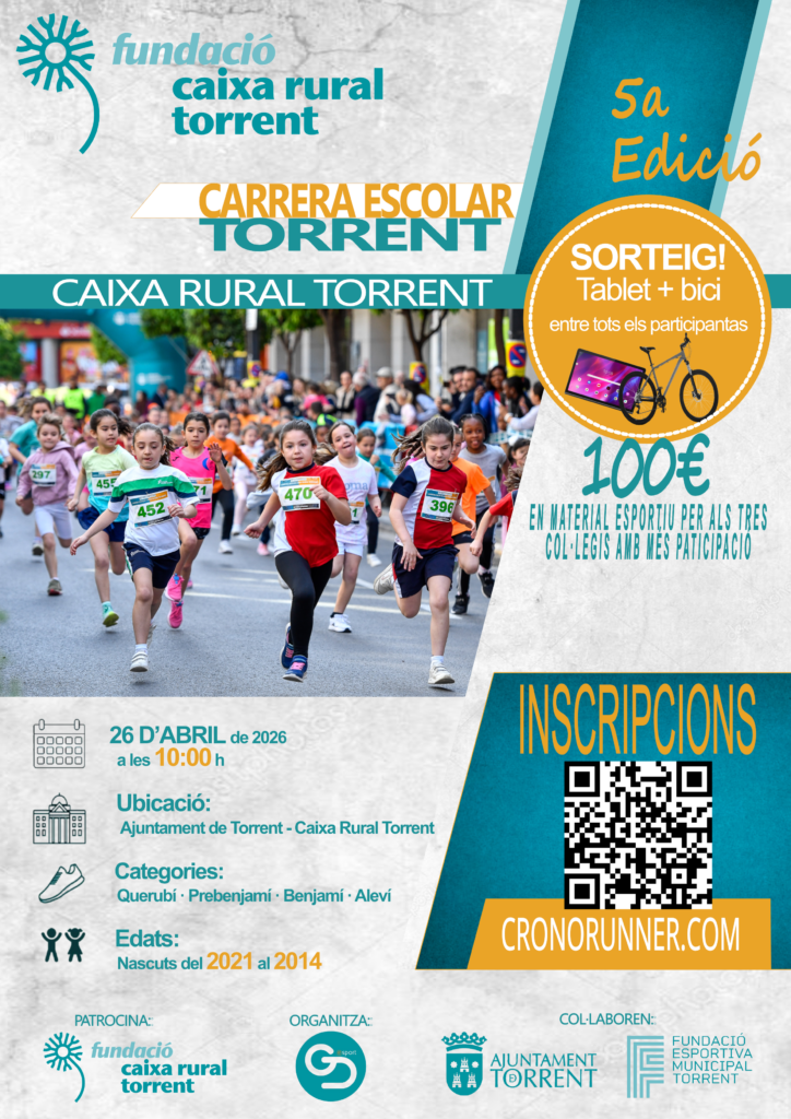 El próximo domingo, 26 de abril, tendrá lugar la V edición de la Carrera Escolar organizada por la Fundació Caixa Rural Torrent. Las pruebas se iniciarán a las 10 horas desde la avenida Al Vedat y las distancias variarán en función de la categoría.